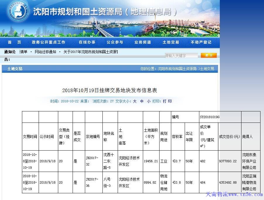 据沈阳市计划和河山资本局10月22日通知布告,于本年10月8日至10月19日挂牌买卖的沈西十二东路-5地块、八号街-3地块已成交,竞得人别离为沈阳东泰环保财产无限公司、沈阳物流正瑞陆港物流无限公司,总面积约28.45万平,计划用处别离为财产用地、物流仓储用地。